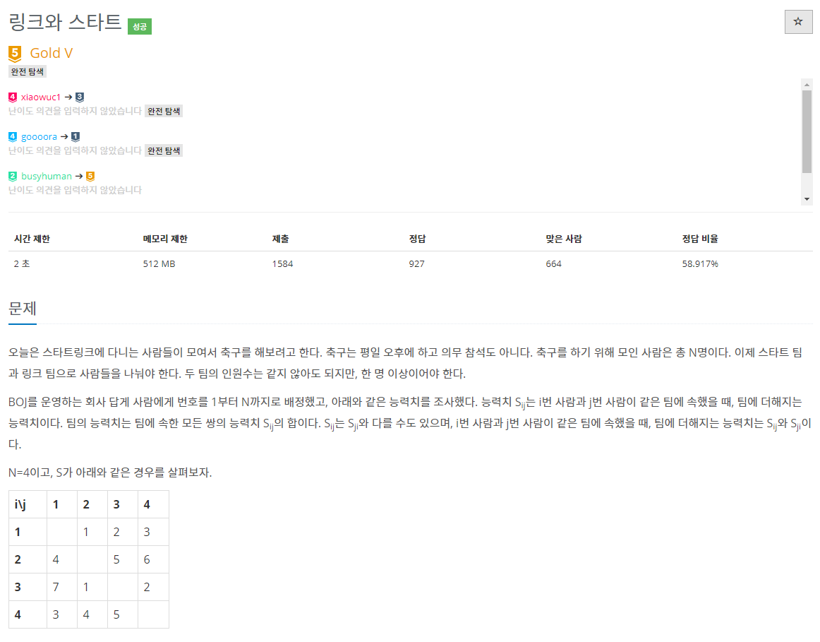 스타트와 링크 문제와는 다르게 정확히 두개의 팀이 같은 팀원수를 가지는 것이 아니라 다른 두개의 팀으로 나눠지기만 하면 되는 문제이다. 그래서 이문제를 비트마스킹으로 접근하였다. 비트 마스킹을 이용하여 예를 들면 N=4일때 0001 부터 1110 까지 수를 구하고 1과 0으로 팀을 나누어서 값을 구하여 비교해주는 방식으로 답을 구하였다.