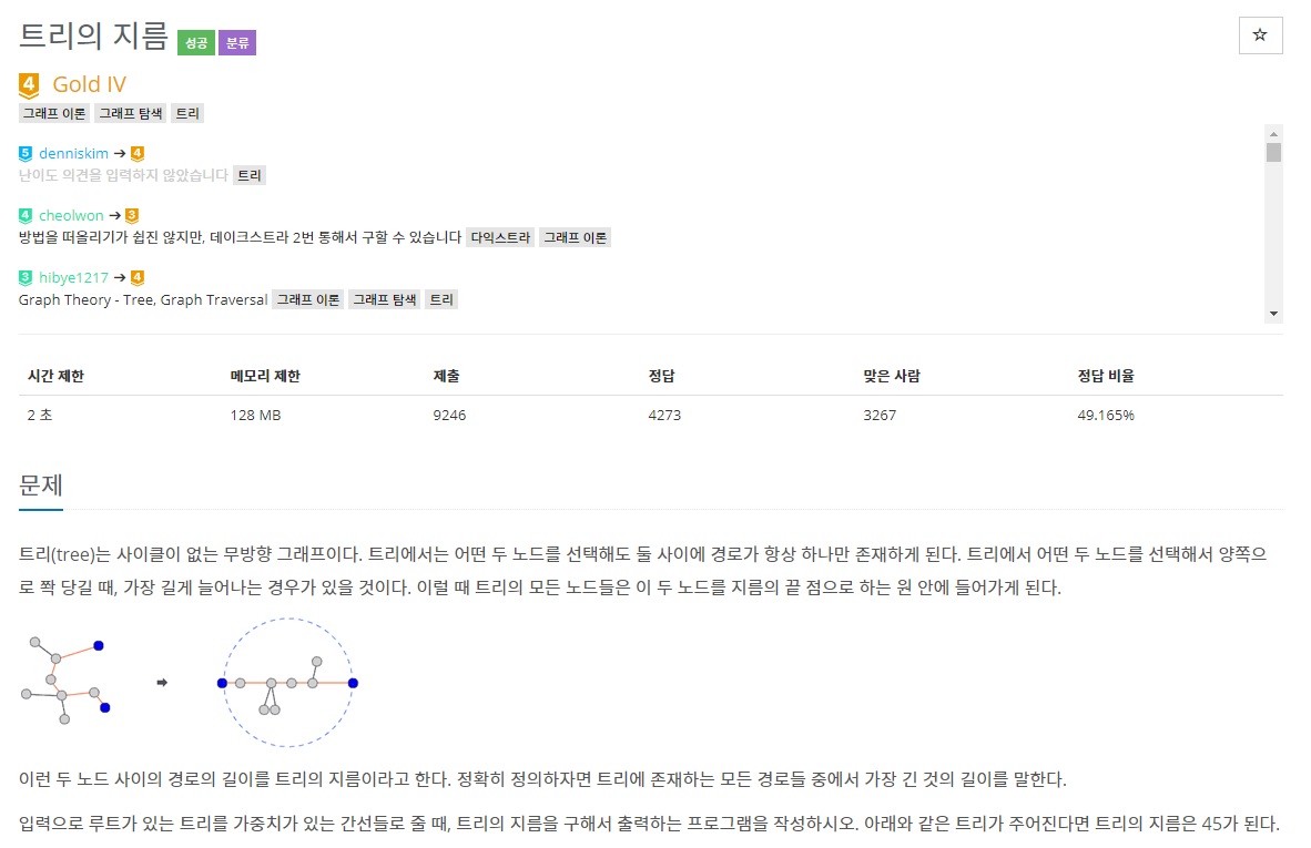 리프노드에서 리프노드까지 가는 가장 긴경우를 지름이라 할 수 있는데 그것을 찾는 문제였다. 맨처음엔 가장 긴 간선을 기준으로 찾아보는 방법을 시도했는데, 가장 긴 간선이 꼭 포함되라는 보장이 없으므로 틀린방법으로 접근하였었다. 도움을 받아 풀었는데 다음과 같은 방법으로 풀었다. 1.루트에서 가장 멀리있는 리프노드의 인덱스를 찾고, 2. 그 리프노드에서 가장 멀리떨어진 리프노드의 거리가 지름. 이와 같은 방법으로 해결하였고, DFS를 이용하여 모든 경우를 다보았다.