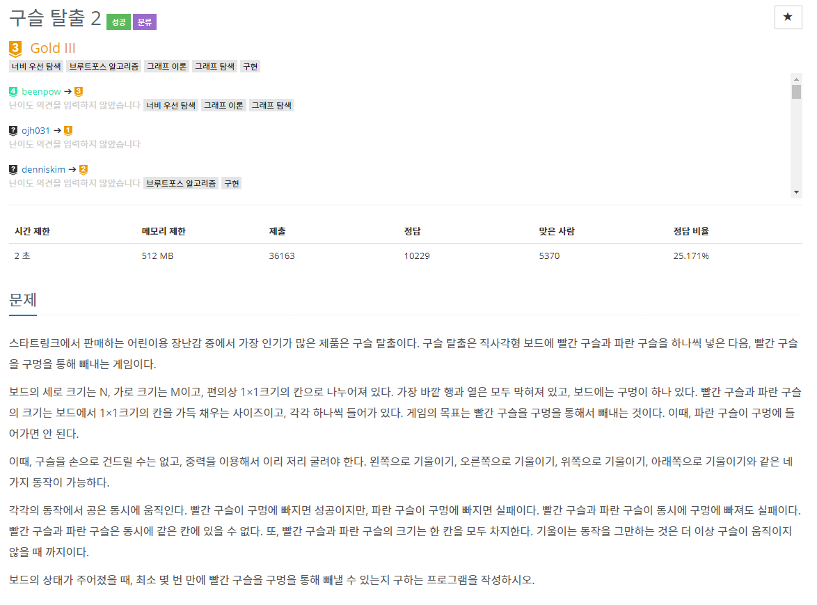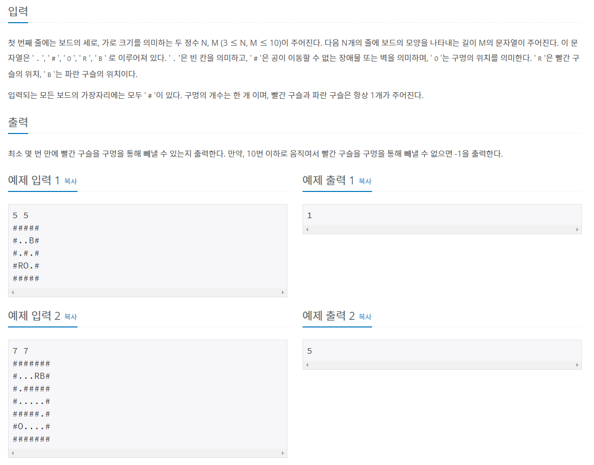 이 문제는 구현치고도 상당히 많은 요소를 꼼꼼히 체크 해줘야 했던 문제이다. 우선 문제에서 포인트는 맨처음 10번이하라는 조건이 주어졌을때 이것을 완전탐색으로 접근해야 했던 점이고, 2차원 배열의 백트래킹이기에 각 재귀에서 재귀함수의 변수로 temp들을 선언후 본래의 map이랑 data들을 백업해놓고 다음재귀호출, 그 후 다시 temp들을 이용하여 복원하는 점이 포인트였다. 또한, 나는 공을 굴릴때 공의 위치에 따라 먼저굴려야할 공을 정하였는데, 이것에 약간의 스킬을 적용하자면 R-B-R순서로 굴려도 같은 결과값을 가지고 올수 있다.