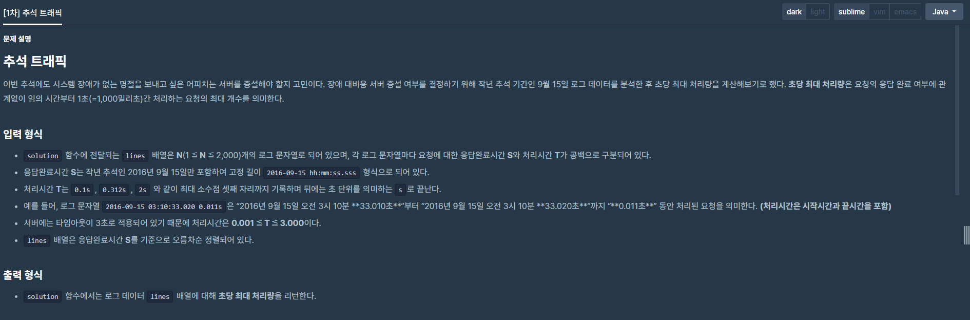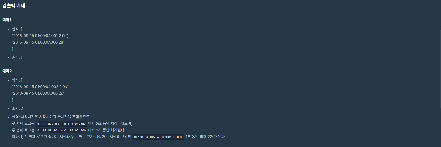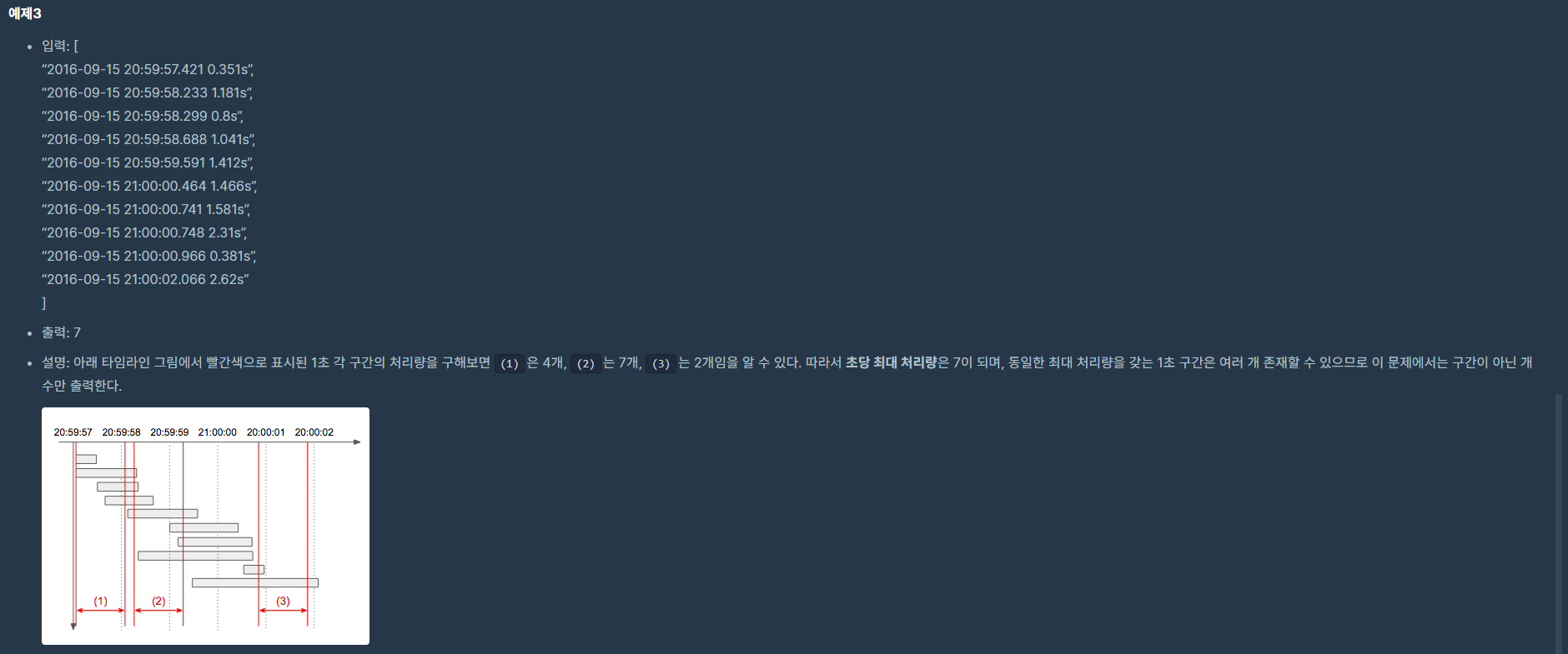 이 문제에서 요점은 입력으로 들어오는 시간을 밀리초(ms) 로 변환시키는 것과 트래픽의 변화가 생기는 것은 시작점과 끝점이라는 것을 파악하는 것이다. 모든 밀리초 시간을 확인할수 없으므로 시작점과 끝점의 1초를 확인하는 방식으로 푼다면 O(n*n) 시간안에 해결할 수 있는 문제이다.