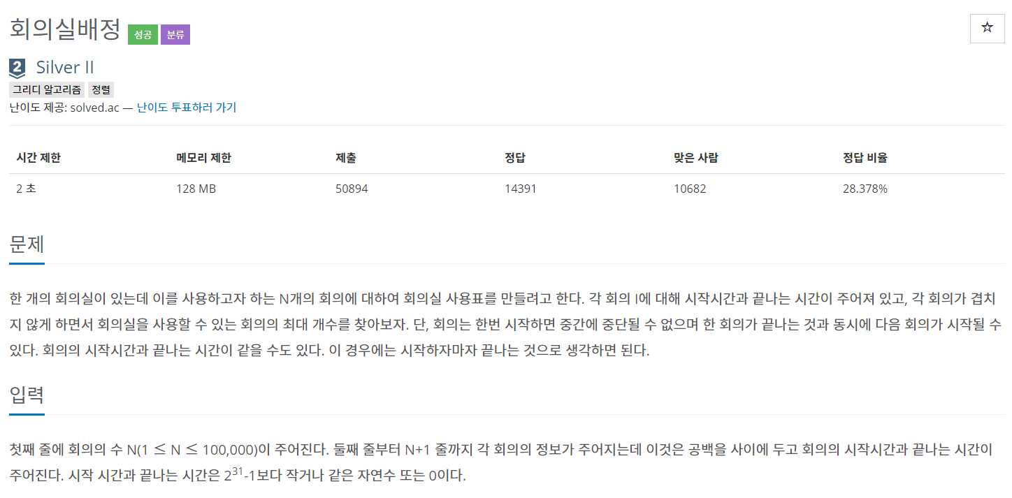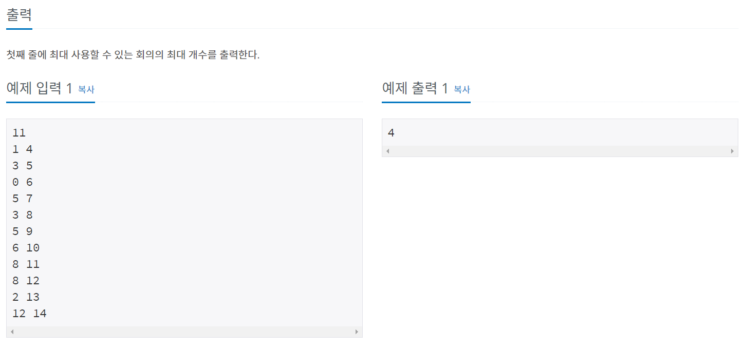 이와 비슷한 문제로 모든 회의를 수용하기 위해 회의실이 최대 몇개가 필요하냐 문제도 있는데, 그 문제는 2번의 방식으로 접근이 가능하다. 회의를 시작시간 순서로 정렬후 현재 노드의 끝시간과 다음번노드의 시작시간을 비교해가면서 queue를 이용하여 최대 회의실을 찾는 방법을 쓸수 있다.