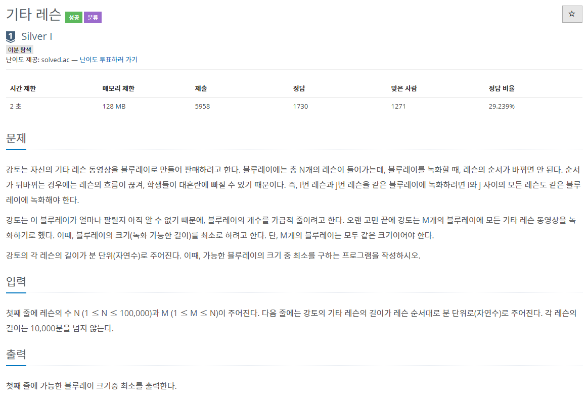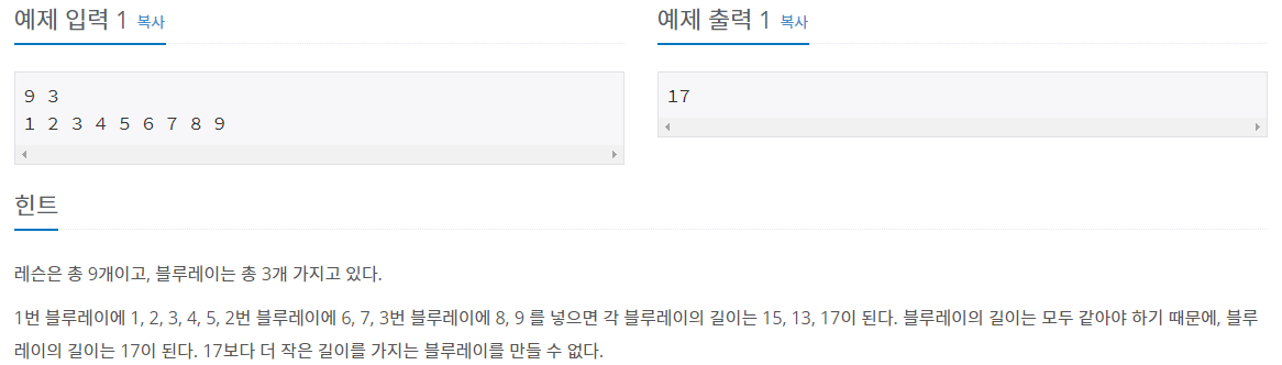 최소값을 찾는것에 이분탐색을 사용하는것이 좋을것이라 생각했는데, 이분탐색의 다음조건을 넘어가는 check함수를 구현함에 있어서 고민을 많이했다. 맨처음엔 단순하게 arr를 M개로 쪼개는 모든 경우의 수를 생각하였는데, N이 최대 100,000이여서 최악의 경우 이분탐색을 사용하더라도 check함수로 인한 시간초과가 발생할 수 있다고 생각하였다. 그래서 단순하게 현재검증해야하는 값(mid)으로 arr를 나눈다면 몇조각이 나오는지 확인하였고, 그것을 M과 비교하여 M이하면 참, 초과면 거짓을 반환하는 check함수를 만들어 사용하였다. 이 check함수에선 또 하나 체크해야 할 것이 있는데 만일 mid값이 arr의 원소보다 작다면 무조건 거짓을 반환하는 조건을 추가하는 것이다.