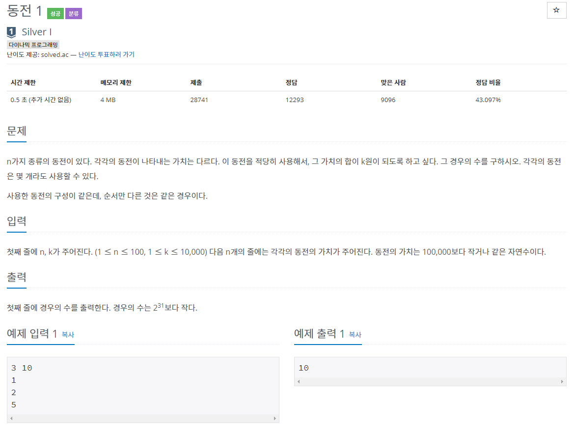 하지만 이문제에선 하나의 조건이 더 있는데 바로 동전의 구성이 같다면 카운팅을 안해주는 것이었다. 바로 중복의 경우르를 제거해주는 것인데, 이것을 어떻게 구현할지 한참을 고민하였다. 답은 바로 1부터 k까지가 아니라 모든 동전에 대해서 먼저 처리를 해주는 것이었다.