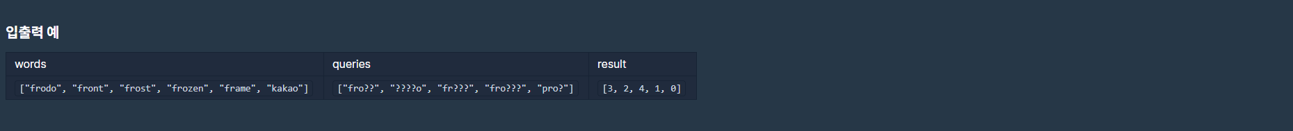 words라는 배열을 통해 단어들이 주어지고 거기에서 quries에 해당하는 것을 찾는 것을 보고, Trie 알고리즘 이라는 것을 깨닫게 되었다. 다만 이문제에서는 주의할점이 있다. 효율성을 따지기에 일반적인 Trie로는 시간초과가 생기고 만일 문자 '?'를 만나게 된다면 그즉시 단어의 갯수를 리턴해주는 방식을 사용해야했다. 그리하여 Node 클래스에 멤버변수로 count 라는 함수를 만들어주었고, insert과정에서 위치마다 count를 늘려주었다. 또한 '?'가 붙는 방법이 두가지가 있는데 앞쪽에 붙어 단어를 형성하는 fro?? 같은 것이 있고, 뒤쪽에 붙어 단어를 형성하는 ????o 같은 것이 있다. fro?? 같은 경우는 count를 쉽게 리턴해줄 수 있지만 ????o의 경우는 맨뒤에 o 때문에 즉시 리턴해줄 수 없다. 그렇기에 단어들이 역순으로 저장되어 있는 Trie를 하나 더 설계해주어서 o???? 와 같은 방식으로 볼 수 있게 해주었다. 마지막으로 모든 문자열이 '?'으로 이루어져있는 경우에는 바로 리턴해줄 수 있도록 배열을 하나 생성해 주었다.