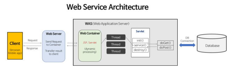 - WAS는 관련된 Servlet을 메모리에 올리고 web.xml을 참조하여 Servlet에 대한 Thread 생성