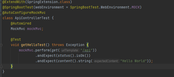 위와 같은 RestController의 API를 테스트 하기 위해 JUnit5를 사용하여 아래와 같은 테스트 코드를 작성해보았다.