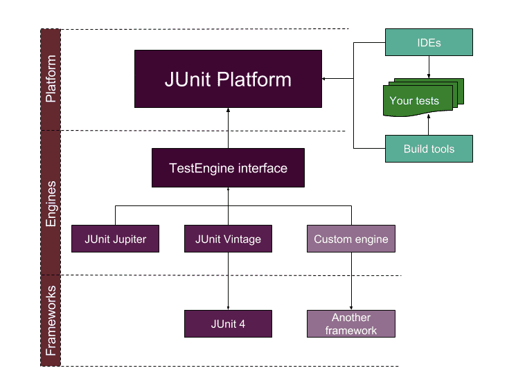 - JUnit Platform : 테스트를 발견하고 테스트 계획을 생성하는 TestEngine 인터페이스를 가지고 있음. Platform은 TestEngine을 통해서 테스트를 발견하고 실행하고 결과를 보고.