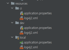 기존의 resources하위에 존재하던 application.properties를 지우고 각 local, dev, ci환경마다 그 배포환경에 맞는 application.properties와 log4j2.xml을 추가해주었다.