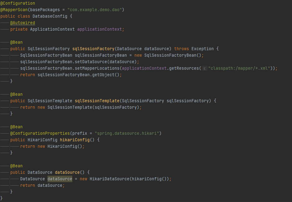 위와 같은 DatabaseConfig.java를 작성하였다. 우선 아래 두개의 메소드 부터 본다면 application.properties에 존재하는 Hikari관련 config를 이용하여 Datasource를 만드는 메소드들이다. 그 후 생성된 Datasource를 이용하여 위의 두개의 메소드에서 MyBatis의 SqlSession을 생성할 수 있도록 도와준다.