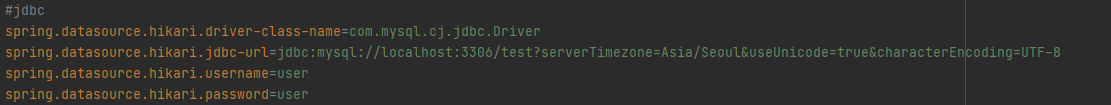 앞서 했던 실습(1)과 다른점은 MyBatis에 대한 설정은 DatabaseConfig.java파일로 잡기때문에 application.properties에서는 JDBC관련 설정만 기입한다는 점이다. 또한, DatabaseConfig.java에서 Hikrai CP 관련 설정을 할때 application.properties에 설정을 가져오기때문에 편한게 가져올 수 있도록 JDBC관련 설정에 hikari를 prefix로 기입해주었다.