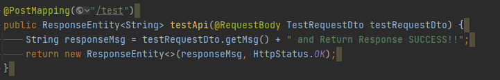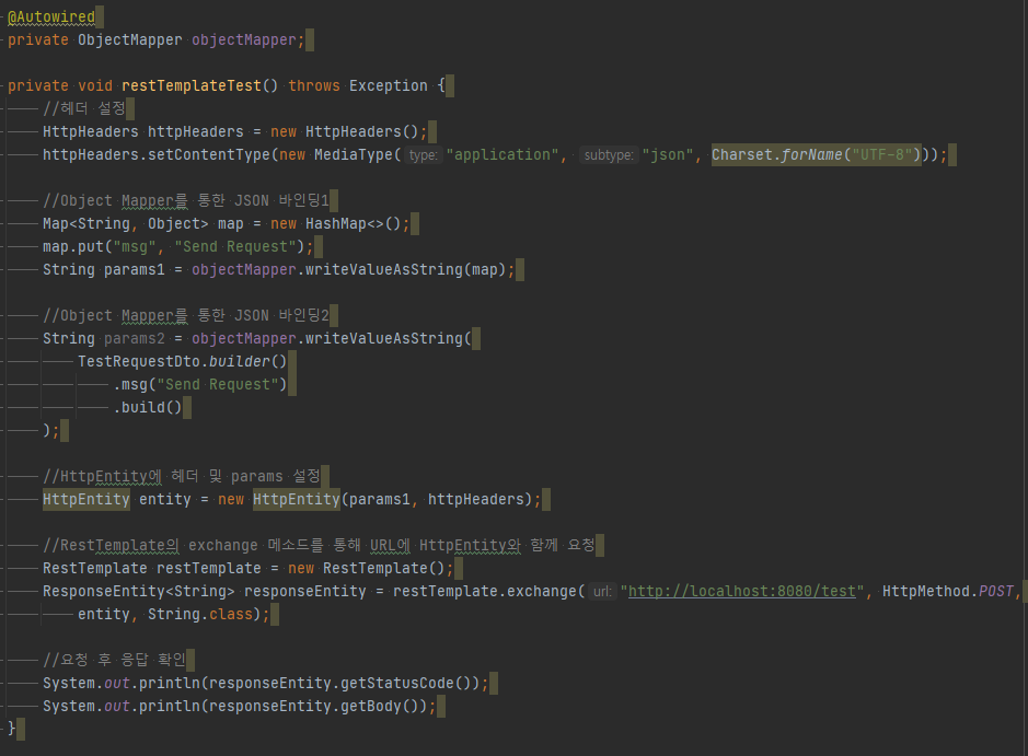RestTemplate의 exchange 메소드를 테스트해보기 위해 위와 같은 메소드를 구현하였다. 일단 JSON을 POST요청의 Body에 넣어줄 예정이어서 헤더에 JSON에 대한 정보를 넣어줘었다. 그 후 보낼 데이터를 ObjectMapper를 사용하여 JSON으로 바인딩 해주었는데 위에선 Map을 사용하는 방법과 DTO를 사용하는 방법 두가지를 이용해서 구현해보았다. HttpEntity에 헤더와 Body에 들어갈 JSON 데이터를 넣어주었다. RestTemplate의 exchange를 보면 아까 구현해놓은 API와 HttpEntity, HTTP 메소드, 그리고 Response의 타입을 파라미터로 사용하였다.