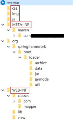 WAR는 웹 애플리케이션을 위한 포멧이기에 웹 관련 자원을 포함하고 있으면 이를 이용하여 웹 애플리케이션을 쉽게 배포하고 테스트할 수 있다. JAR와 달리 WAR는 WEB-INF, META-INF 등의 사전 정의 된 구조를 사용하고, WAR 파일의 실행을 위해서는 웹 서버 또는 WAS가 필요하다.