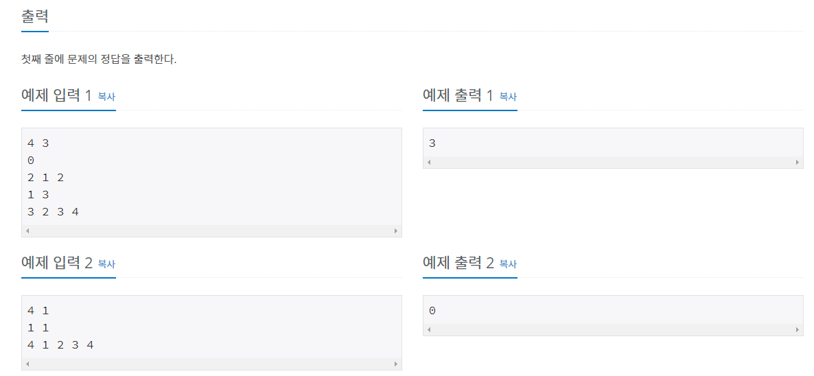 우선 파티의 인원을 전부 입력을 받고, 파티마다 참석자들을 union 해주었다. 그 후 이미 진실을 알고 있는 자 들과 파티의 참석자간의 루트값을 비교하여서 진실을 알고있는 사람들을 모두 선별해주고, 그것을 기준으로 거짓을 얘기할 수 있는 파티를 찾았다. 유니온파인드를 사용할때 주의할점이 있는데 서로의 루트 노드가 같은지를 확인할 때에는 단순히 p[i] , p[j] 값을 비교하는게 아니라 find(i), find(j)를 비교해주어야 한다. 이 부분을 주의할 필요가 있다.