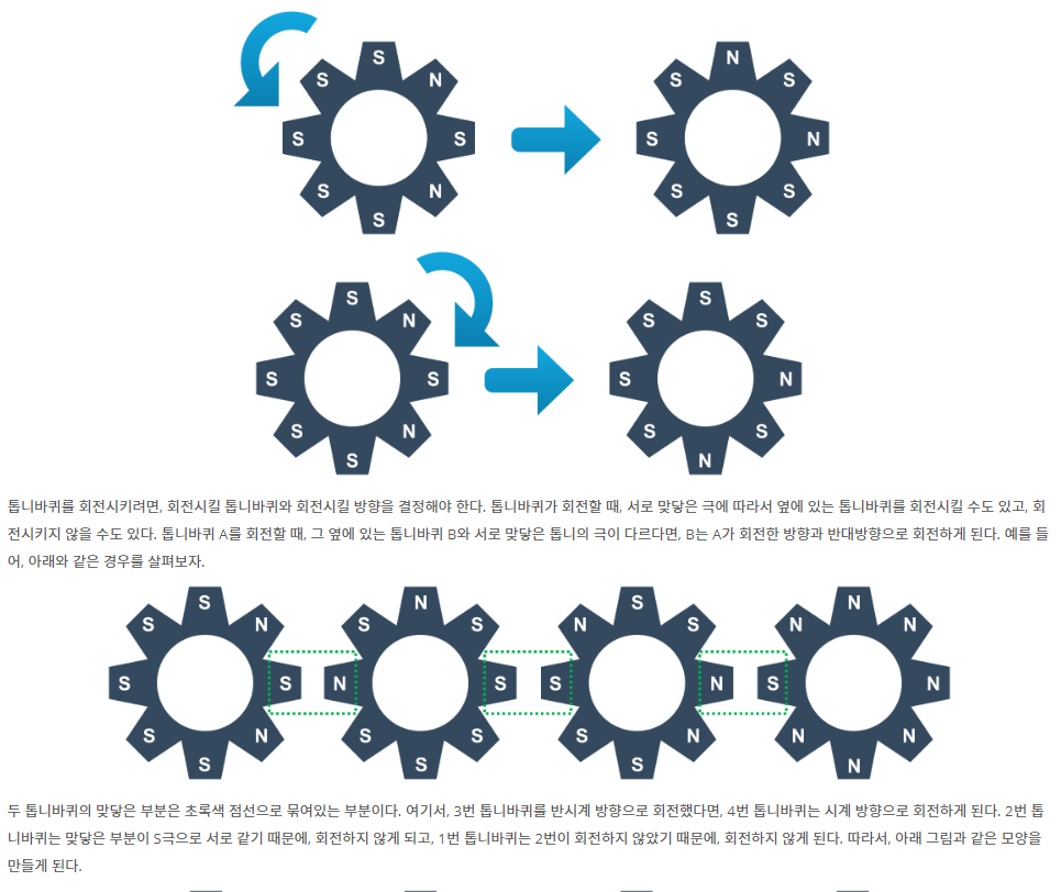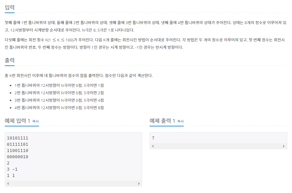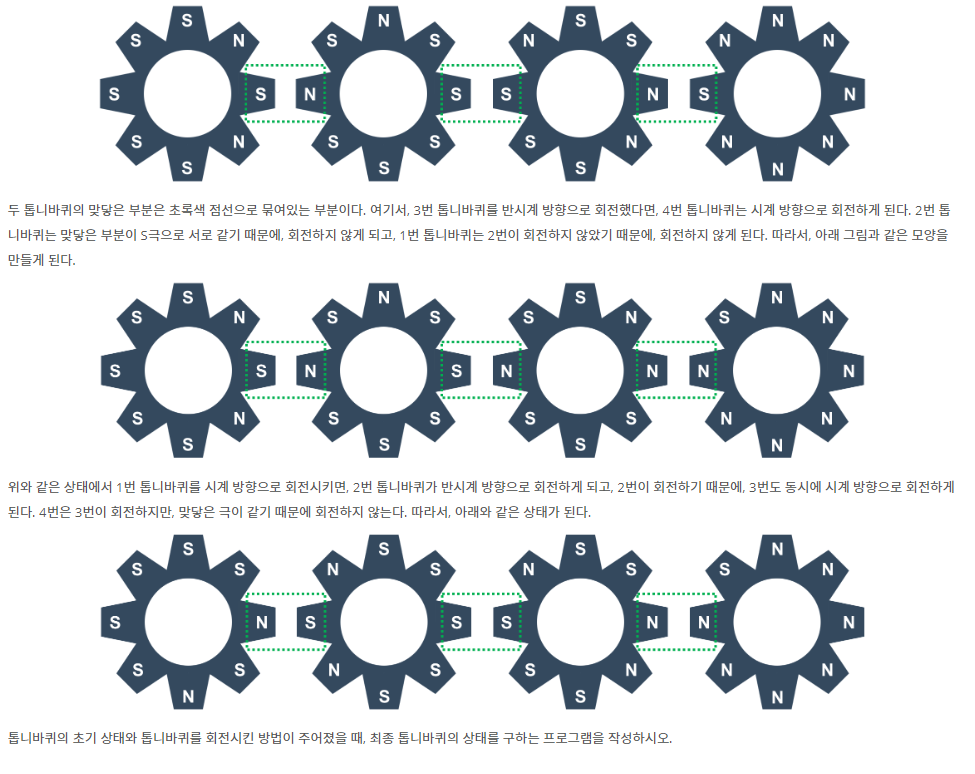 단순 구현 문제이기 때문에 문제에 주어진 조건그대로를 수행하게 된다면 풀 수 있는 문제이다. 하나의 톱니바퀴가 돈다면 양쪽으로 끝지점 까지 영향을 끼칠 수 있으므로 left함수와 right함수를 만들어서 양 끝 인덱스 까지 재귀를 하는 방식으로 구현하였다.