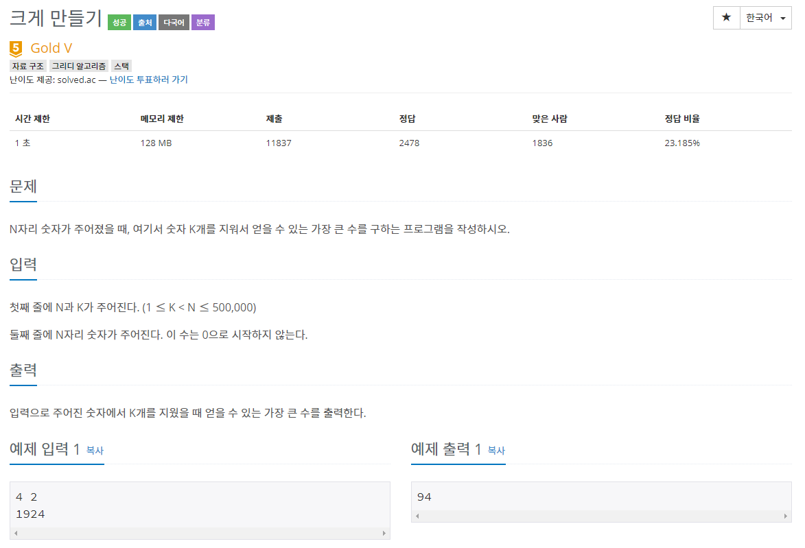 이 문제는 숫자의 앞에서부터 스택에 집어넣으며 순서를 지키며 가장 큰 수를 만드는 문제이다. 즉 다음과 같은 로직을 가진다. 현재 스택에 집어넣어야할 숫자에 대해서 만일 지울 수 있는 횟수가 남아있고, 스택의 top 값이 현재 숫자보다 작다면 스택의 top을 제거하는 것을 반복하고 현재 숫자를 스택에 push해주는 원리이다. 그후 최종적으로 N-K만큼의 길이를 스택의 bottom에서부터 보여주는 방식으로 해결할 수 있다.