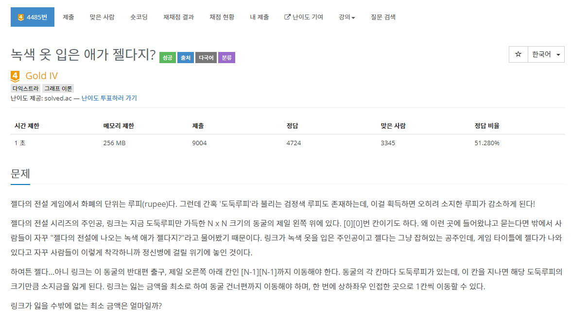 문제를 맨처음 보았을 때 단순하게 백트래킹으로 모든 경로를 확인해보았다. 하지만 주어질 수 있는 동굴의 크기의 최대값이 125이기 때문에 시간초과가 발생하게 된다. 따라서 다익스트라를 활용해보았다. 다익스트라는 기본적으로 다음과 같은 원리로 동작한다.
