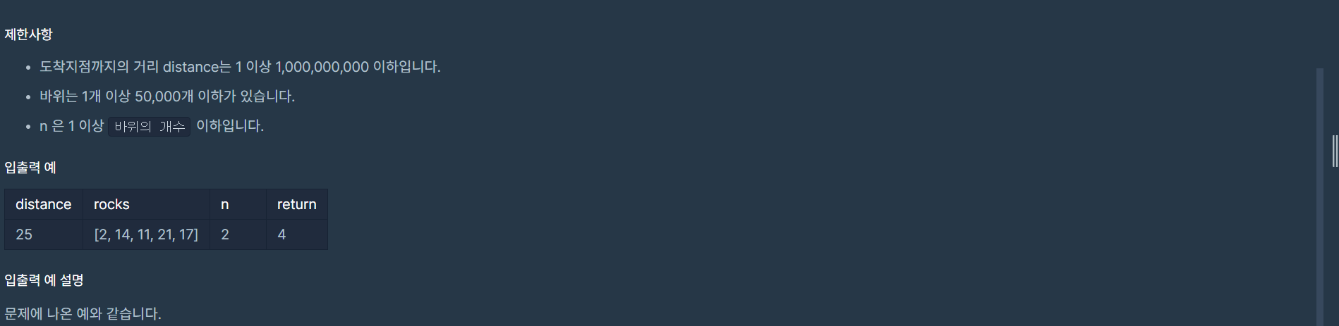 low값을 바위사이의 최소 거리인 1, 그리고 high값을 바위 사이의 최대거리인 distance로 두고, 이분탐색을 돌면서 mid 값보다 크거나 같도록 바위를 배열하게 된다면 몇개의 바위를 부숴야 하는지 확인하고, 바위를 부술 수 있는 최대값 n 과 비교하여 바위 사이의 최대 간격을 찾는 방법으로 문제를 해결해보았다. 즉 다음과 같은 로직으로 접근하였다.