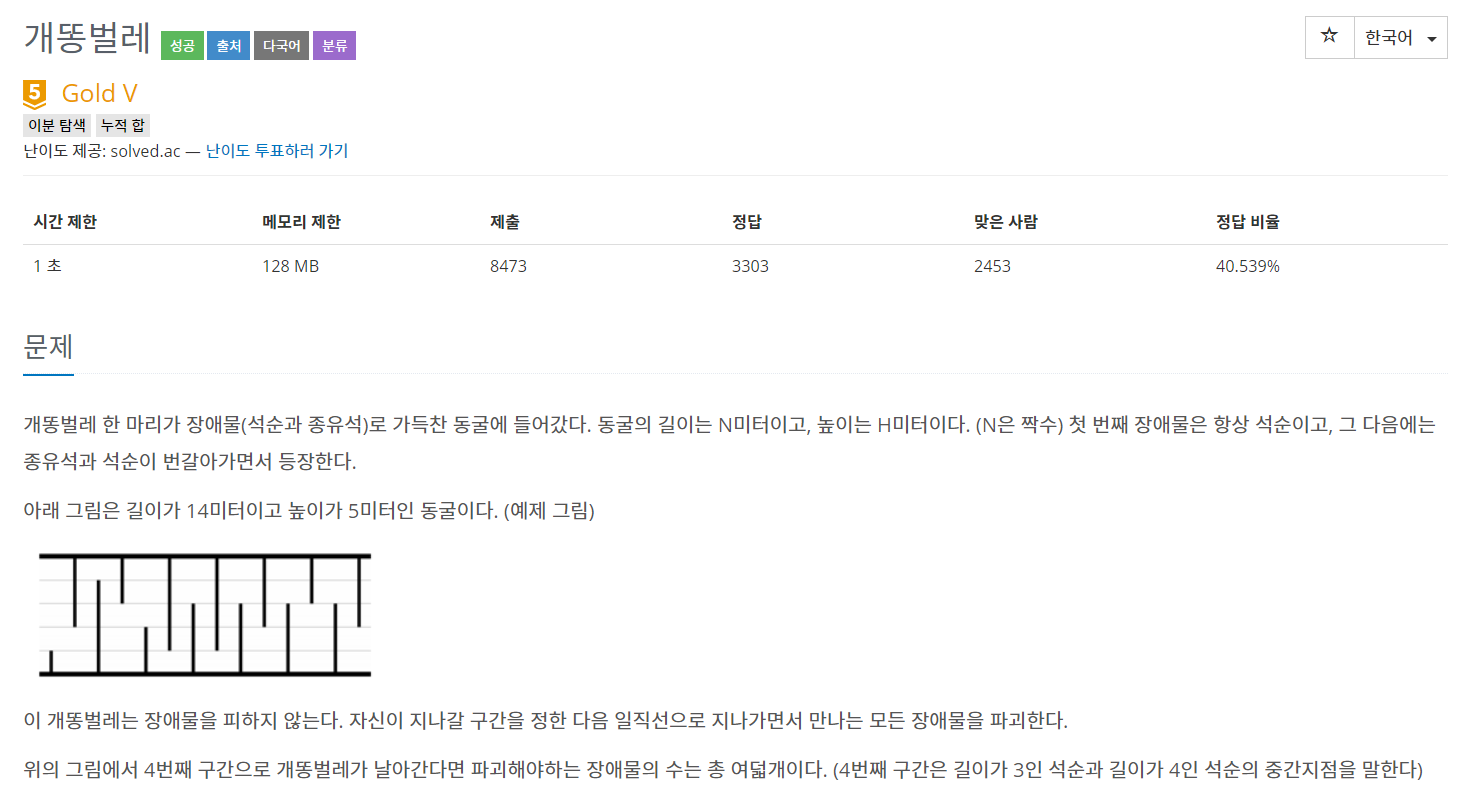 문제를 맨처음 봤을때 단순히 브루트포스로 접근하여 모든 라인에서 모든 장애물을 카운트하는 방식을 사용하려고 했으나, 최대 장애물의 수가 200,000개, 최대 라인의 수가 500,000이 나오게 됨으로 시간초과를 피할수 없을것같다는 생각이 들었다. 그래서 생각해본게 높이당 장애물의 수를 저장하고, 그것을 이용하여 높이당 넘어야할 장애물의 누적수를 구한다음 모든 높이(라인)에서 몇개의 장애물을 넘어야하는지 계산하였다. 다만 주의할점은 장애물이 위방향, 아래방향 두가지가 나오게 됨으로 나누어서 계산을하고 인덱스를 적절히 조정하여 높이(라인)에서 몇개의 장애물을 넘는지 구하였다.