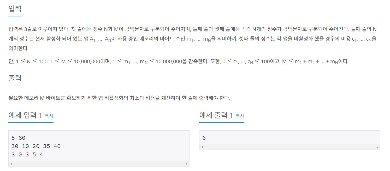 Knapsack dp문제를 활용하여 접근해보았다. dp[N][cost]를 생성하고 메모리가 기준값을 넘을 때 마다 cost값을 최솟값으로 갱신하는 방법으로 접근해보았다. 맨처음 이 문제를 접근했을때 cost값대신 메모리 값으로 접근하였는데, cost 값기준으로 접근하는 것을 생각해내는데 오래걸렸다. 다만 cost값을 기준으로 접근하니깐 문제를 수훨하게 풀 수 있었다.
