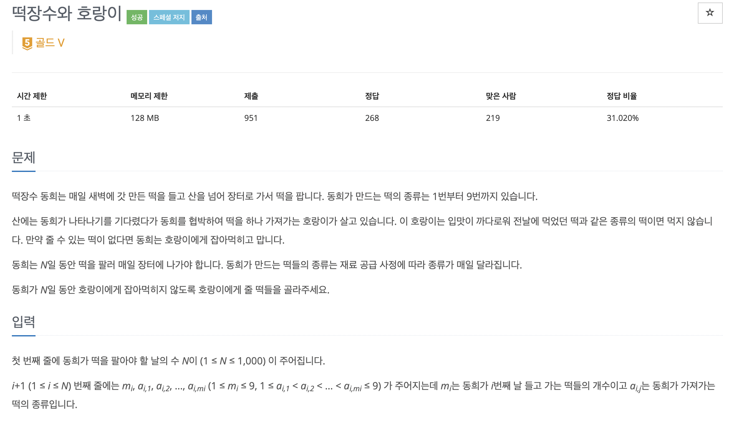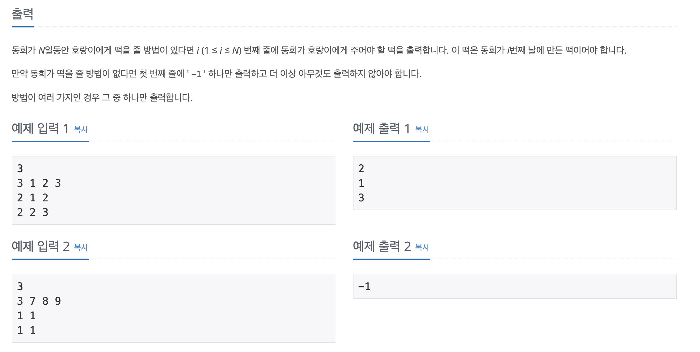 맨처음 문제를 접했을때 아무생각없이 바로 DFS를 적용해봤는데, 역시나 최악의 경우 8^1000(전날의 떡을제외한 경우^날짜수)이 나오기때문에 시간초과를 면할 수 없었다. 그래서 바로 방문체크로 가지치는 방법을 택해주었다. visit[i번째날][떡]을 하나 만들어서 만일 이전날의 떡과 다르면서 visit[오늘][떡]이 방문 가능하다면 방문을 하고 방문체크를 해주는 방식으로 구현해보았다. 이렇게 된다면 어떠한 방식으로든 오늘에서 가질수 있는 떡을 중복으로 방문하는 것을 막을 수 있게 된다.