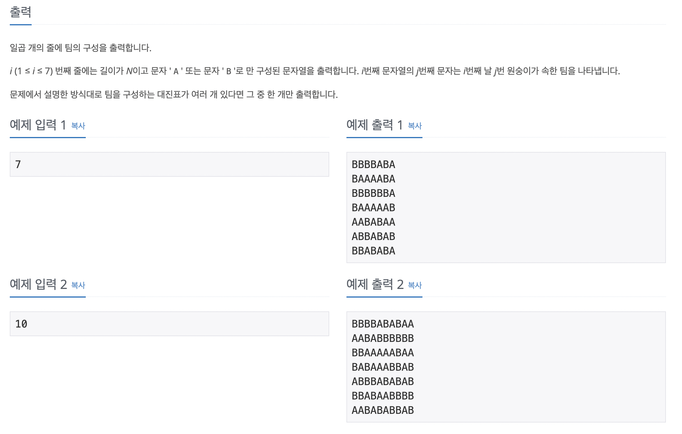 이 문제 같은경우 맨처음 문제자체를 이해하지 못하였다. 하지만 분할정복이라는게 떠올랐고, 머지소트와 비슷한 원리로 접근해보았다. 우선 7일을 출력하기 위해 result란 이차원배열을 만들어두고, 분할정복을 시도하였다. 우선 start와 end값을 받고, 이들의 중간값인 mid를 구하게 된다. 이렇게 start~mid, mid~end 까지 두 그룹으로 나누고 알파벳을 각 각 배정해준다. 이렇게 되면 두그룹은 서로 한번은 적으로 만나는 것이 보장이되게 된다. 이런식으로 재귀호출하여 분할정복을 적용해보았다. 단 맨끝 결과에 오로지 B로만 차있는 경우가 생기게 되는데 이경우엔 A를 임의로 하나 넣어주었다.