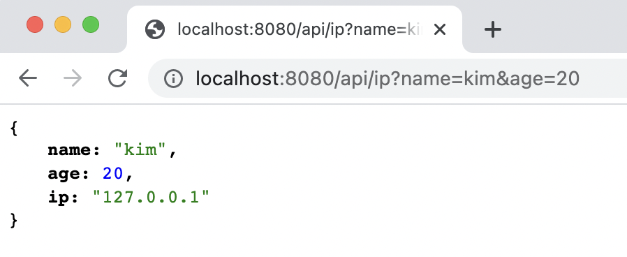 /api/ip 라는 API를 호출했을때 위와 같은 결과를 얻을 수 있었다. ClientIpArgumentResolver를 거쳐서 UserInfo의 바인딩된 name, age, ip를 얻었다. name 과 age는 query String에 들어온 값이 기대대로 나왔고, ip의 경우 local환경이기에 127.0.0.1을 확인 할 수 있었다.