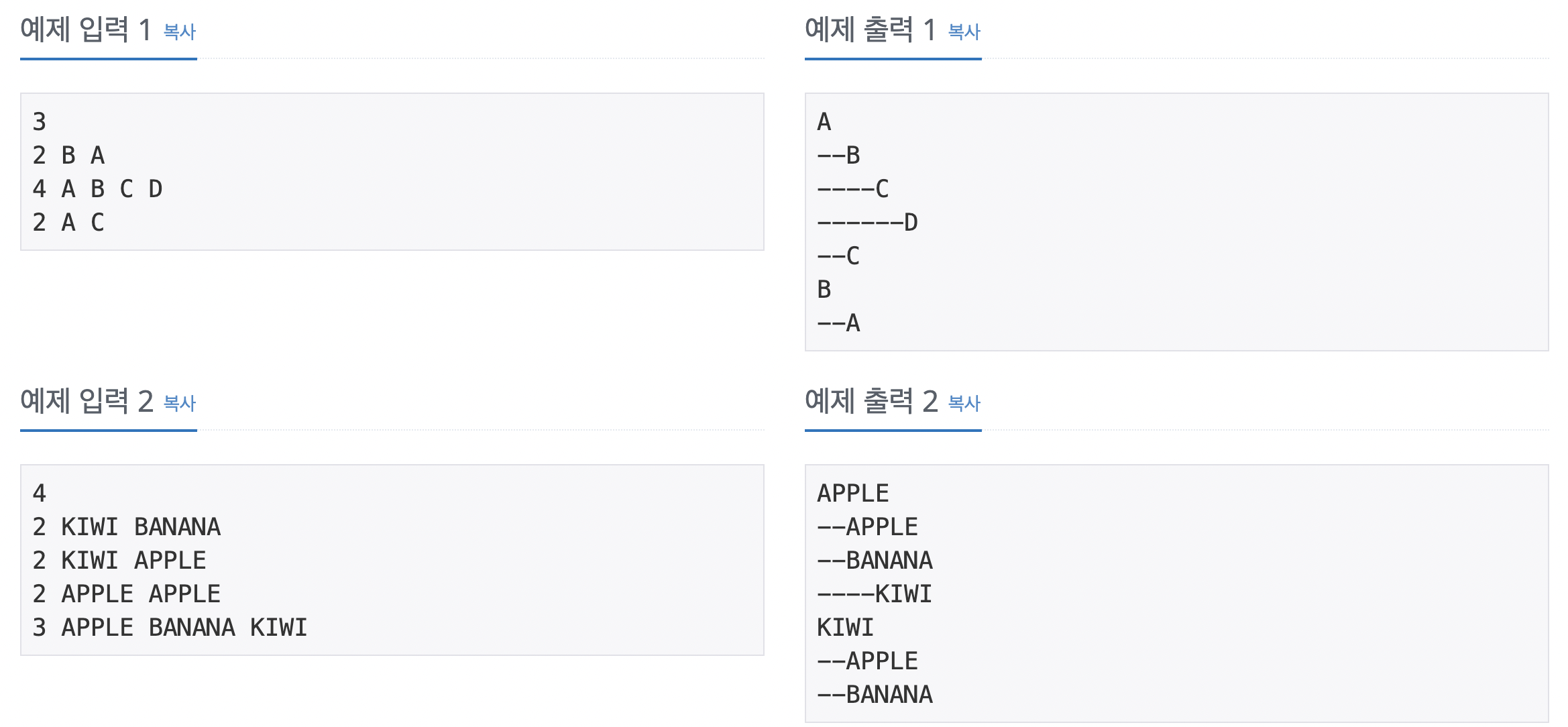 Trie를 활용하기 위해 Node라는 클래스를 만들고, 그안에 child라는 Map구조의 Node를 주었다. 일반 적인 Trie문제와 다르게 배열대신 Map을 활용해보았다. 그렇게 모든 입력들을 root아래 저장 후, DFS를 활용하여 출력을 해주었다. 단, 이때 알파벳순 출력이 필요하기때문에 Map의 keySet을 정렬된 리스트의 형태로 만들고 문제를 풀었다.