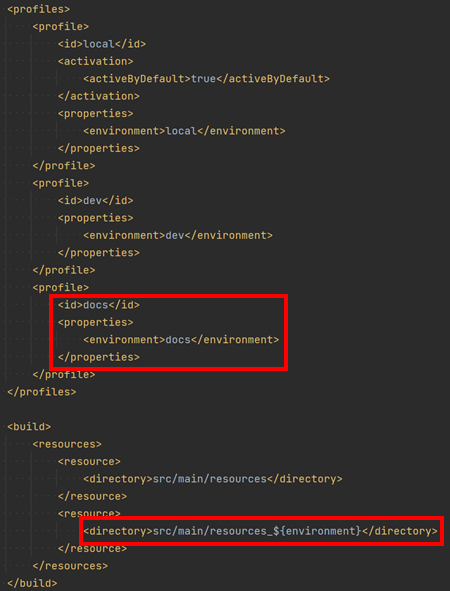 본론으로 돌아와 Springboot 프로젝트의 Spring REST Docs를 특정 서버에 배포하게 되었다. 이 서버는 API 문서 만을 위한 서버여서 Spring REST Docs와 관련된 테스트 코드만을 처리하도록 설계하였다. 따라서 docs 라는 Maven Profile을 구성하고 이에 따라 특정 테스트 코드만 실행시키도록 해주었다.