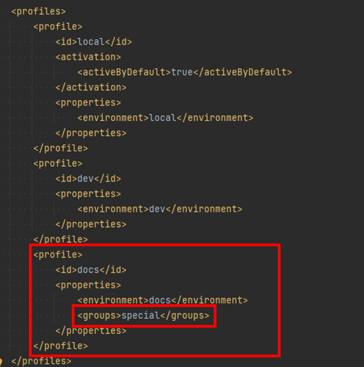 우선 local, dev, docs profile중에 docs를 활용할 예정이라 docs profile에서 property로써 groups를 선언해주었다. 그 후 다음과 같은 테스트 코드들을 실험해보았다.