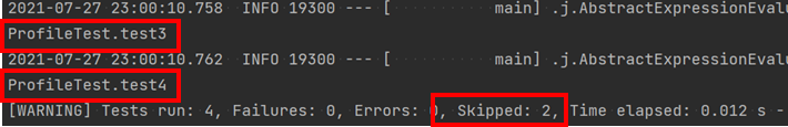 그 결과 EnbledIf 값이 true인 test3와 test4만 실행이 되고 나머지 test1과 test2가 skip이되는 것을 확인 할 수 있었다.