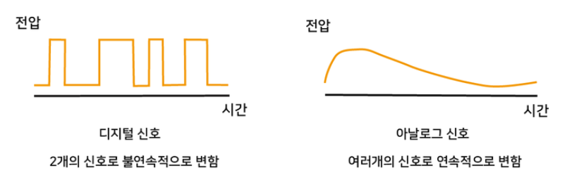 전압이 일정 패턴으로 변하여 생기는 일련의 흐름으로 전압의 변화가 모여서 만들어진 신호. 전기 신호들을 주고 받음으로써 네트워크에서 사진이나 문서를 주고받음.