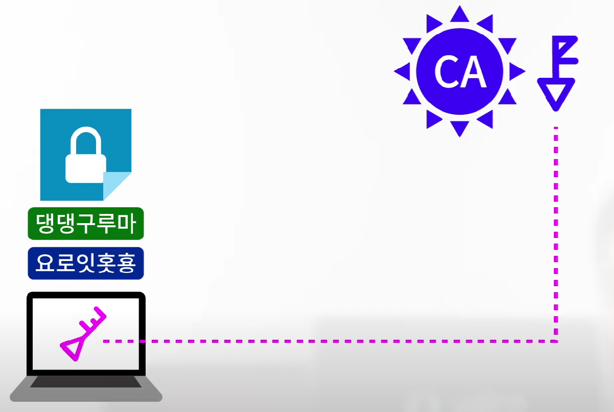 HTTPS는 SSL과 같은 프로토콜을 사용하여 공개키(비대칭키)를 기반으로 데이터를 암호화한다. 데이터는 암호화되어 전송되기 때문에 임의의 사용자가 데이터를 조회해도 원본을 볼 수가 없다. 서버는 클라이언트가 요청을 보낼때 암호화를 하기 위한 공개키를 생성해야 하는데, 이때 CA에게 공개키를 전송하여 인증서를 발급 받는다. 다음과 같은 과정이다.