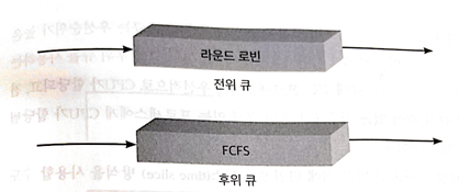 멀티레벨 큐는 준비 큐를 여러개로 분할해 관리하는 스케줄링 기법이다. 프로세스들이 CPU를 기다리기 위해 한줄로 서는 것이 아니라 여러줄로 서게 된다. 프로세스의 성격이 다른 프로세스들을 별도로 관리하고, 성격에 맞는 스케줄링을 적용하기 위해 별도로 준비 큐를 두게 된다. 따라서 일반적으로 멀티레벨 큐에서 준비 큐는 빠른응답을 필요로 하는 대화형 작업을 담기 위한 전위 큐와 계산 위주의 작업을 담기 위한 후위 큐로 분할하여 운영한다. 전위 큐에서는 응답시간을 짧게 하기 위해 라운드 로빈 스케줄링을 사용하고, 계산 위주의 작업을 위한 후위 큐에서는 응답시간이 큰 의미를 가지지 않기때문에 FCFS 스케줄링을 사용한다.