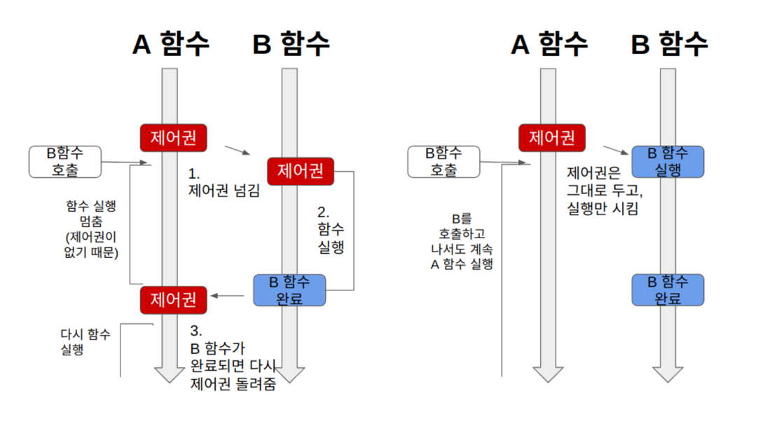 - 함수를 호출하는 곳에서 호출되는 함수가 결과를 반환할 때까지 대기