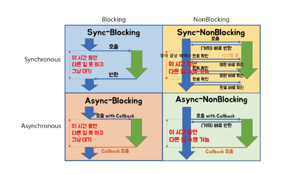 https://velog.io/@nittre/%EB%B8%94%EB%A1%9C%ED%82%B9-Vs.-%EB%85%BC%EB%B8%94%EB%A1%9C%ED%82%B9-%EB%8F%99%EA%B8%B0-Vs.-%EB%B9%84%EB%8F%99%EA%B8%B0