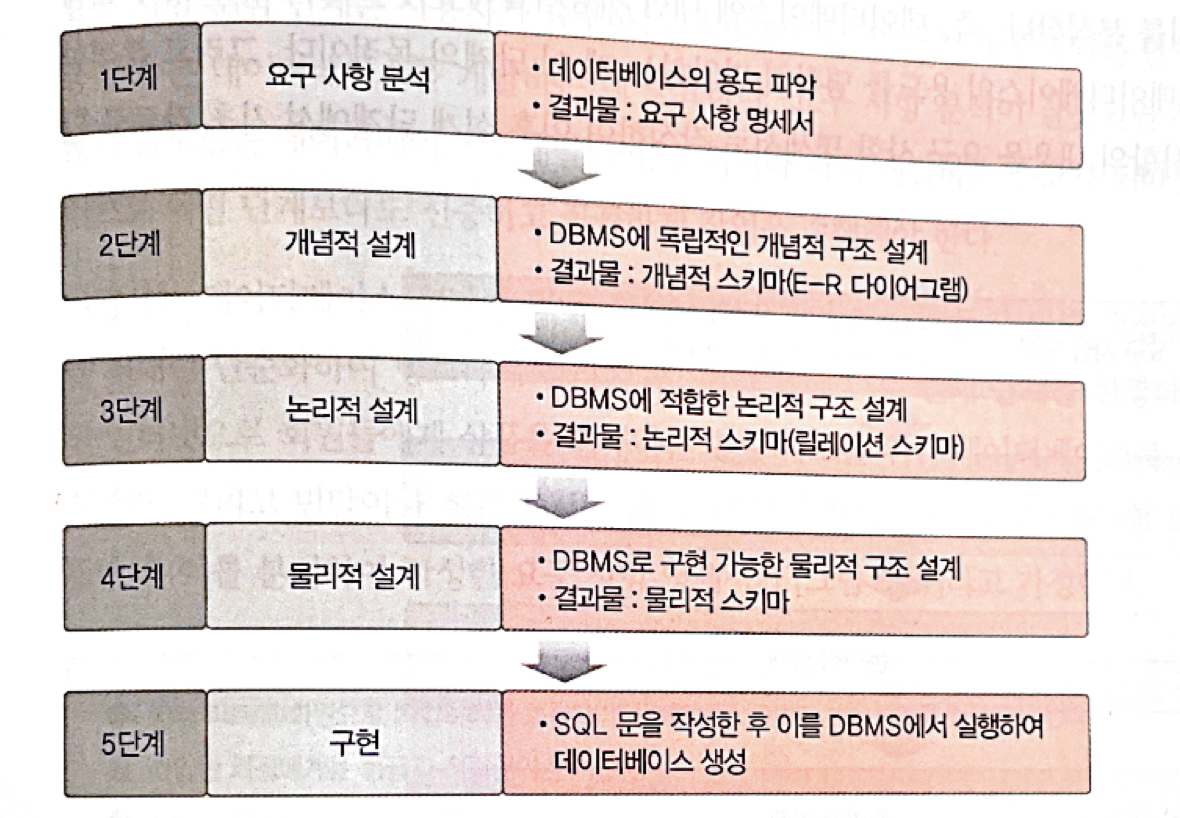 E-R 모델과 릴레이션 변환 규칙을 이용한 데이터베이스 설계는 다음 5단계로 이루어진다.