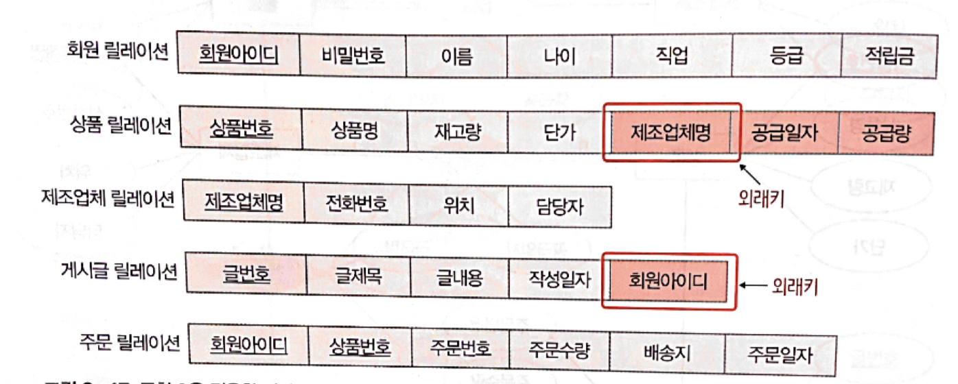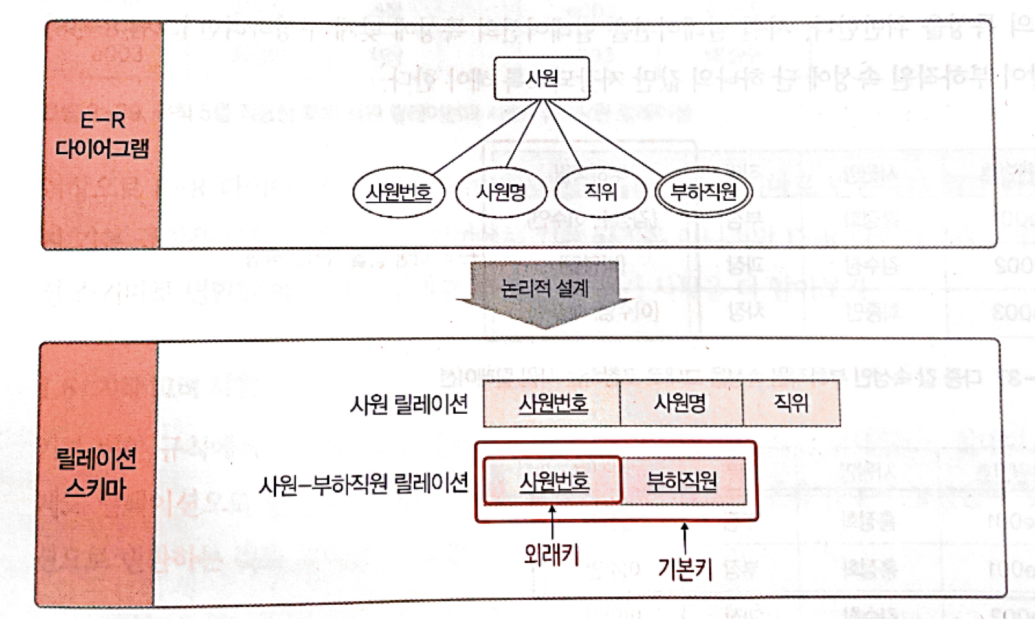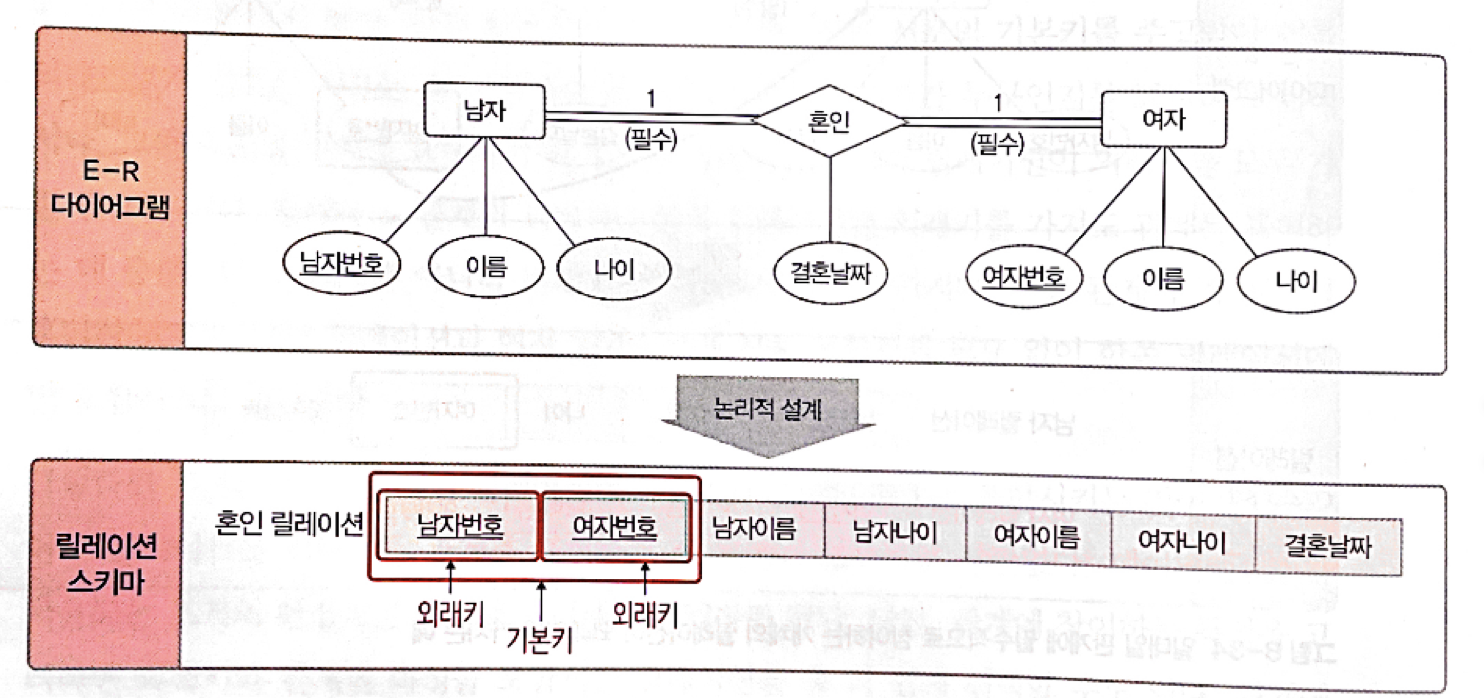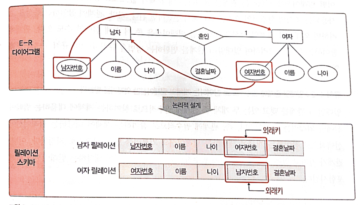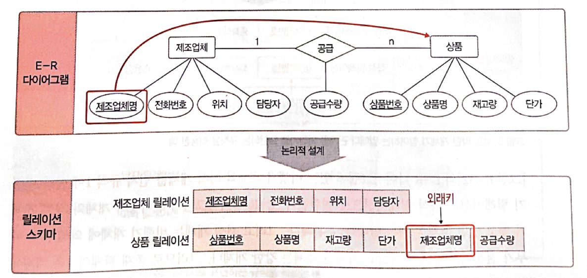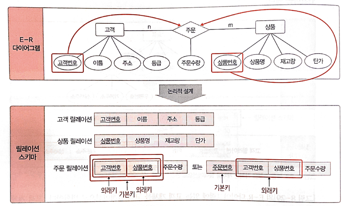 다만 E-R 다이어그램에 표현된 개체와 관계는 릴레이션으로 표현하는 방법이 다르다. 따라서 릴레이션 스키마로 변화하는 방법을 5가지로 규칙화하여 변환한다.