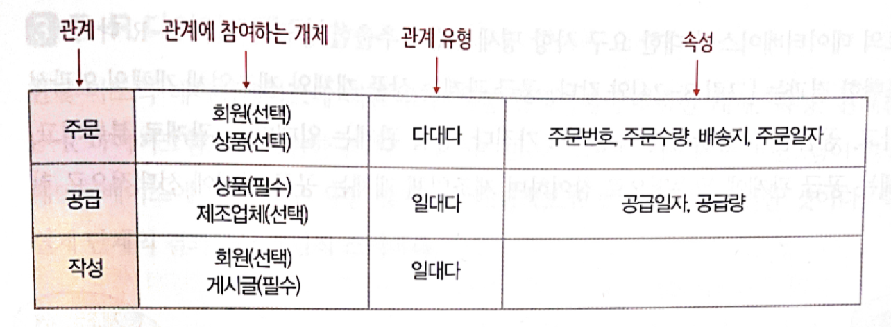 개체와 속성을 추출하고 나면 개체 간의 관계를 결정할 수 있다. 관계는 개체간의 연관성으로써 보통 명세서 기준 동사로 나타내어 진다. 관계를 추출한 후에는 추출한 관계에 대해 매핑 카디널리티와 참여 특성을 결정한다. 즉, 개체 인스턴스의 개수를 기준으로 일대일, 일대다, 다대다 등을 결정하고 필수참여인지 선택탐여인지를 결정한다.