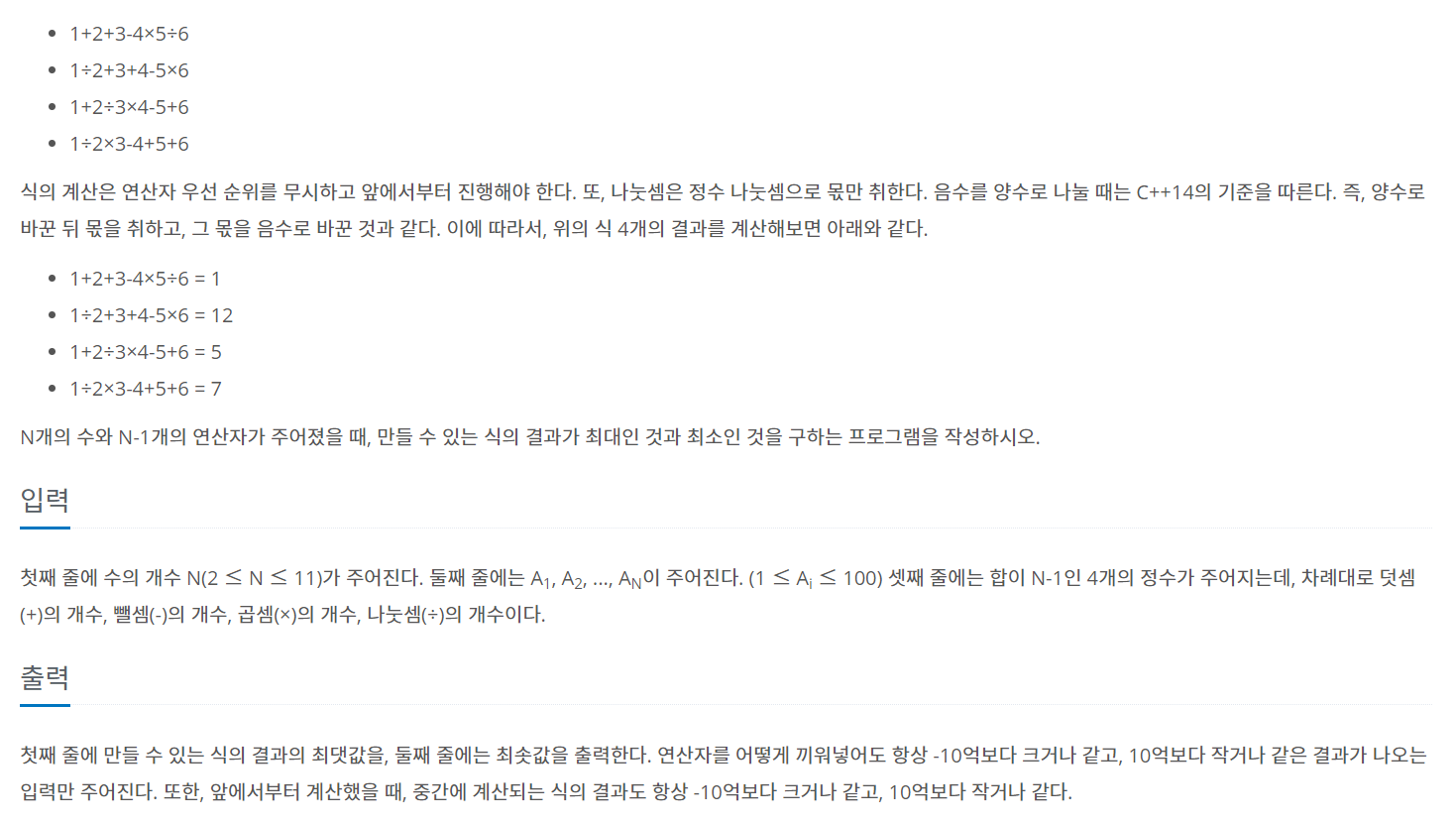 하지만 이문제에서 주의할점은 순열을 구해하는 수,기호 에는 중복이 되는 것이 있으므로 무조건 nextPermutation()을 직접 구현해야 풀 수 있는 문제이다. 연산자들을 모아놓은 op배열을 생성후 모든 number에 대하여 연산을 해주면 쉽게 풀어지는 문제이다. 관건은 nextPermutation()의 직접 구현이다.