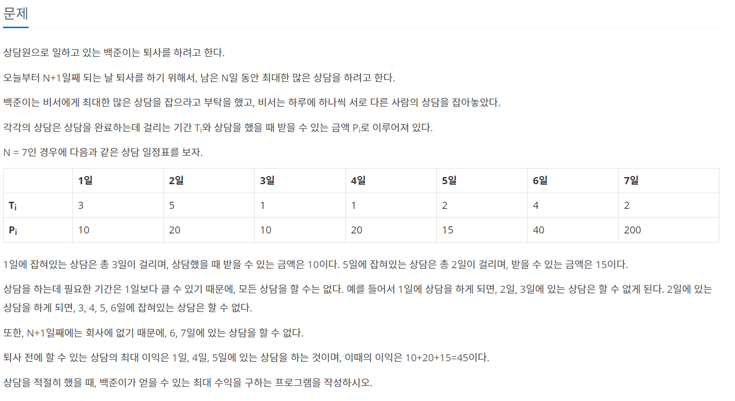 재귀를 함에 있어 1)선택하고 , 2)선택하지 않고를 기준으로 재귀를 반복하였다. 기저조건으로는 날짜 N의 범위를 넘어갈때를 체크하였다.