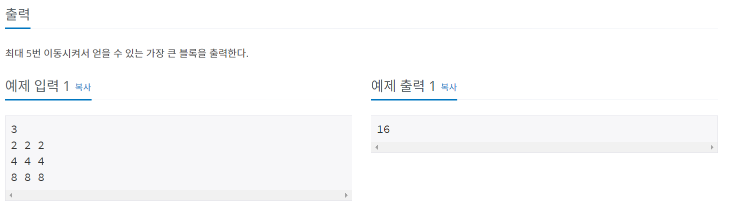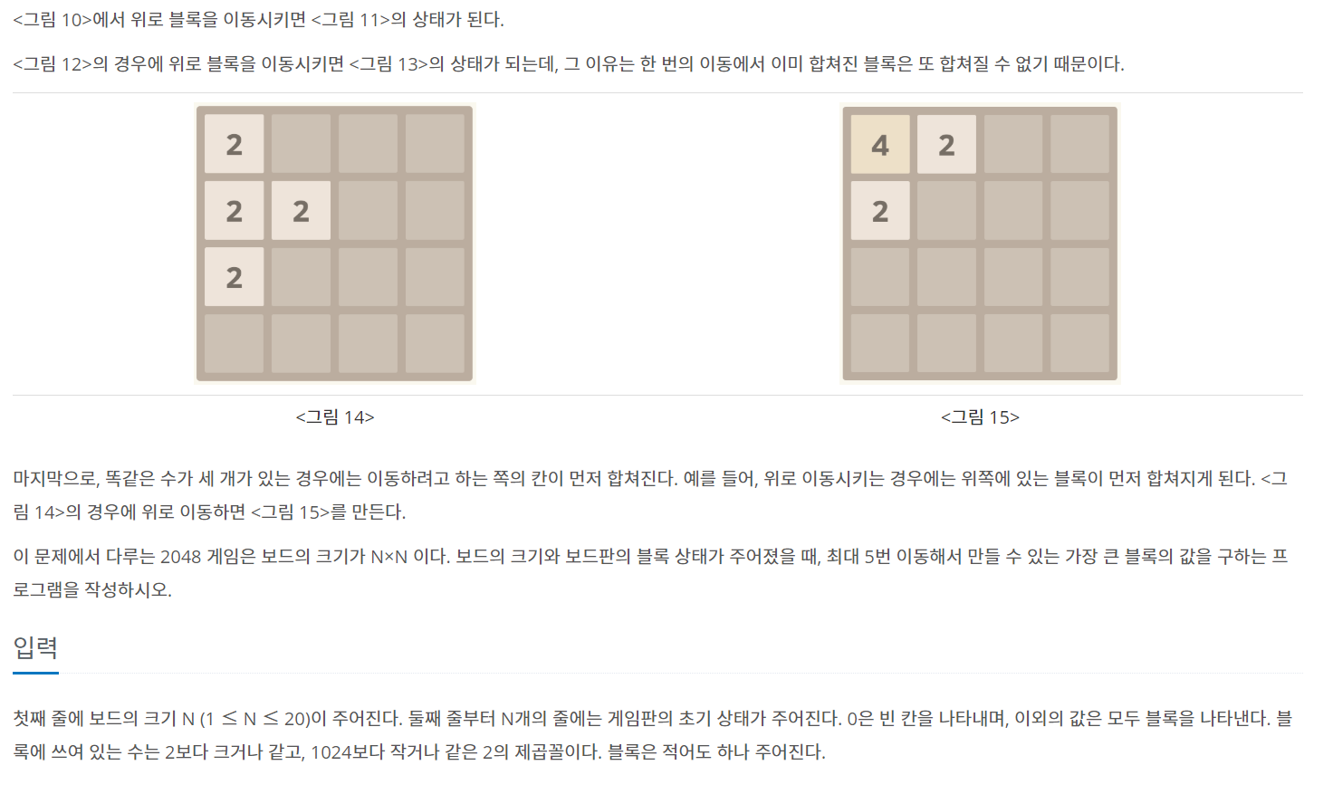 이문제는 2048을 구하는 단순구현과 4가지 방향으로 5번을 가봐야하는 과정이합쳐진 문제였다. 2차원 배열을 이용하여 재귀를 도는 백트래킹은 처음 구현해봐서 어떻게 해야하는지 고민을 많이했다. dfs()란 함수에서 이차원 배열을 저장할 temp[][] 를 이용하여 해결하였다. 즉 재귀함수호출전 temp에 map을 다 저장하고 재귀함수 호출뒤 map에 temp를 다시 복원시키는 방법을 사용하였다. 간단한 방법이지만 생각하는 부분에 있어서 많은 시간을 사용하였다.