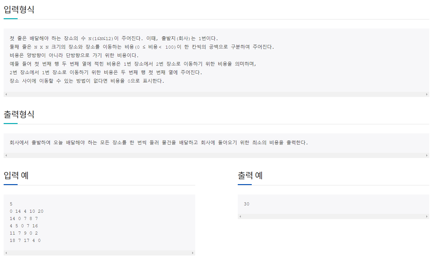 다른 말로는 TSP, 외판원 순환 문제라고 한다. 이 문제는 다양한 풀이 방법으로 접근 할 수 있지만 N의 값이 12 이하로 주어졌으므로 백트래킹을 이용한 완탐을 사용해보았다. 단, 순열의 완탐을 돌때 첫번째 점(0)을 제외한 N-1개의 순열을 구하고 이때 마지막에 해당하는 점에서 첫번째점(0)으로의 경로가 존재하는 경우 최종답을 확인해주는 방식으로 구해준다. 또한 방문시에 최저값을 갱신할수 있을때만 방문하는 조건을 사용하여 시간을 줄였다.
