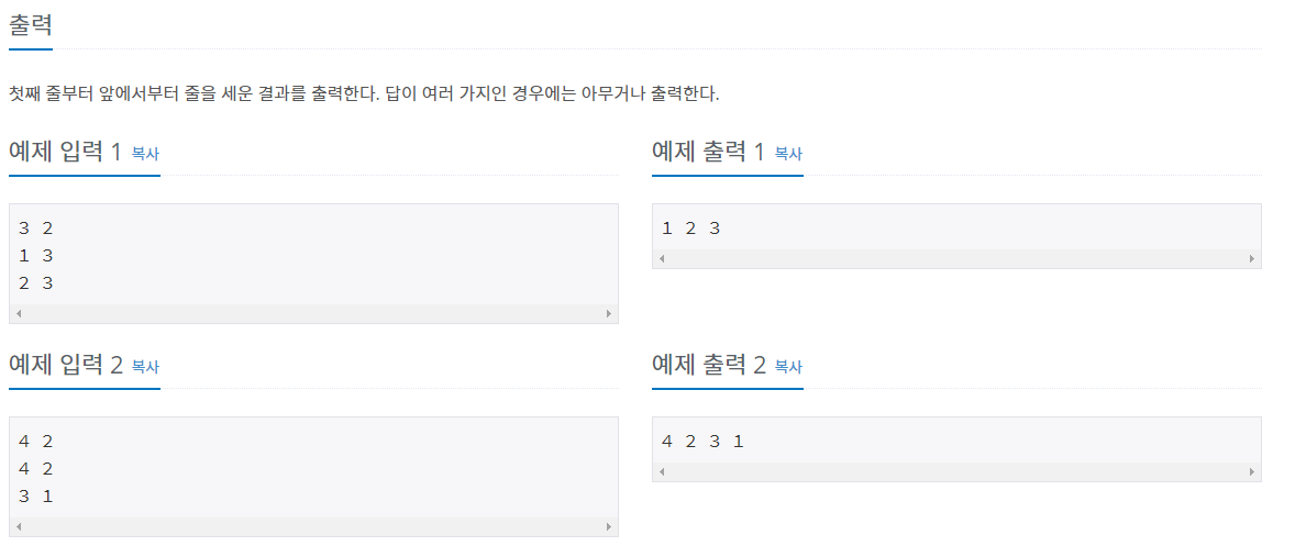 이 문제는 위상정렬(Topoologicl Sort)를 이용하는 문제이다.