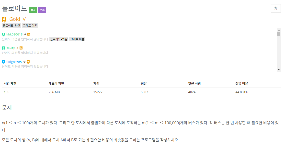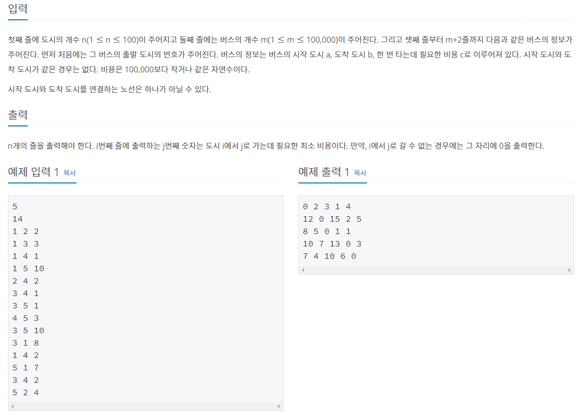 이 문제의 경우엔 최대 n이 100이하이고 출력시 모든 점에서 모든 점에 대한 최소비용을 출력해야함으로 가장 간단히 구현할 수 있는 플로이드와샬 알고리즘을 사용하면 된다. 플로이드와샬은 3중 for문을 이용한 알고리즘으로 만일 한점을 거친 거리가 더 가깝다면 갱신을 해주는 식으로 모든 정정들을 확인하는 알고리즘이다.