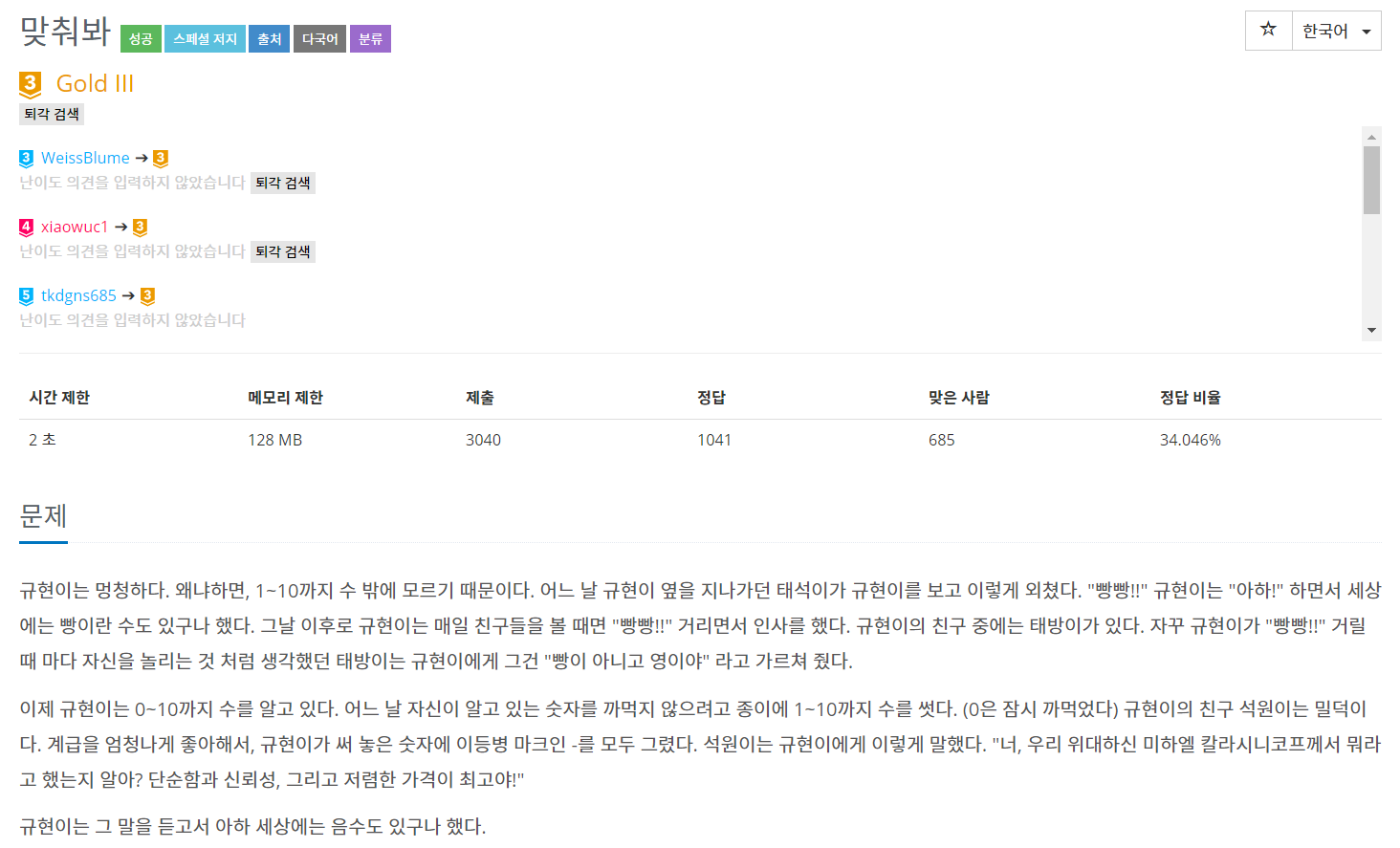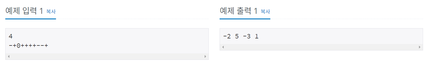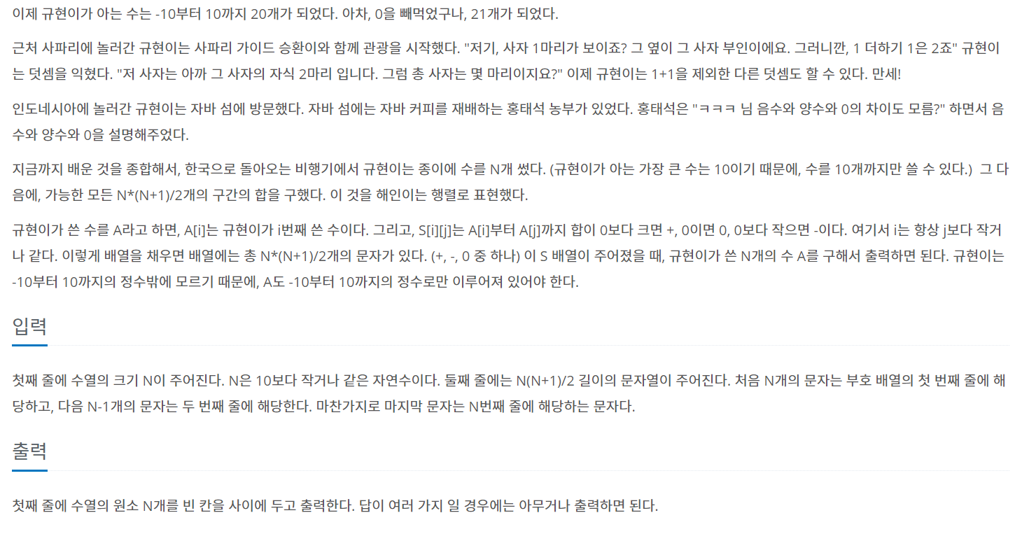 처음엔 간단히 단순 순열로 접근하여 푸는 문제 인지 알았다. 하지만 최악의 경우 21P10을 가지게 되므로 가지치가 상당히 중요한 문제로 생각하였다. 일단 문제를 쉽게 접근하기 위해 -,+,0으로 주어진 문자열을 2차원 배열의 형태로 만들어주었다. 행을 0부터 N까지로 잡고, 열을 현재행부터 N까지로 주어서 삼각형모양의 2차원배열을 만들었다. 그 후 순열로 접근하였다. 일단 순열을 0부터 N-1까지 정해줄때 해당 index는 2차원배열의 행과열이 같을때의 index의 부호와 같기때문에 크게 경우의 수를 줄일 수 있었고, 그 후 check라는 함수를 만들어 2차원배열의 해당 열의 원소들을 체크해주는 식으로 가지치기를 하였다.