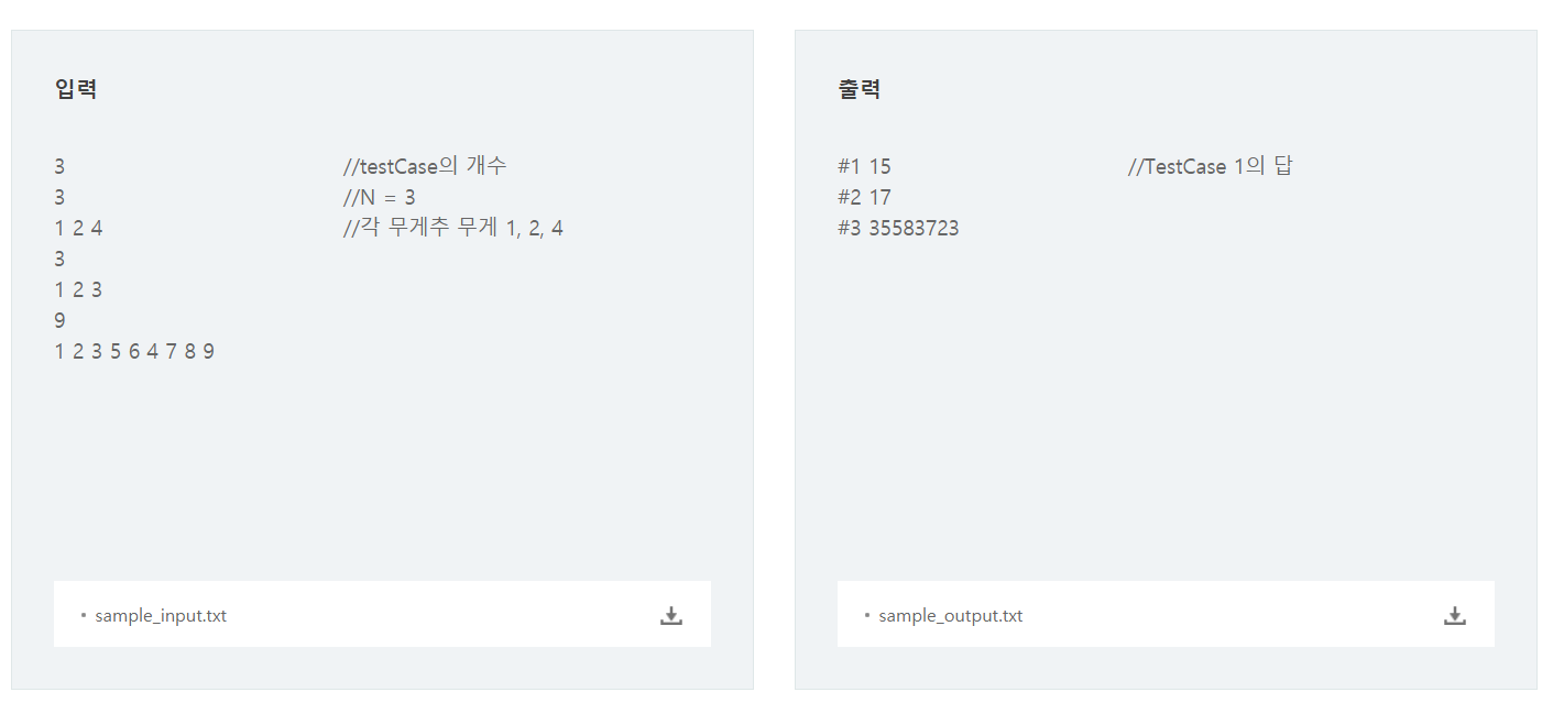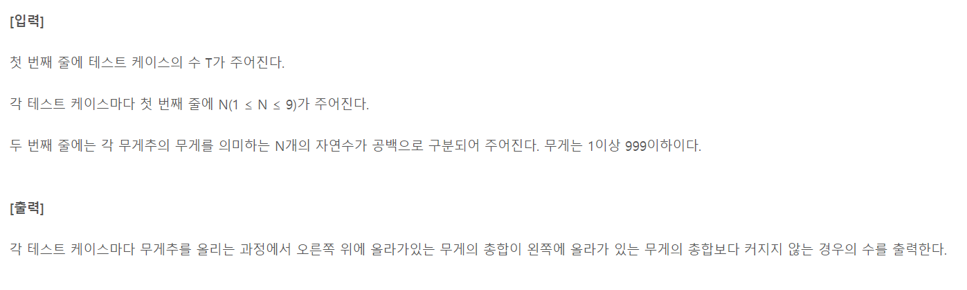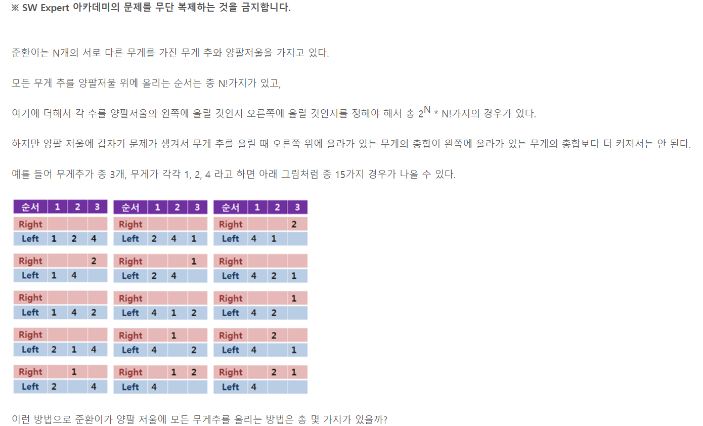 주어진 추를 왼쪽에 놓을때, 오른쪽에 놓을때의 경우를 재귀로 호출하며 풀수있는 문제이다. 다만 여기서 주의할점이 있다. 저울이 양쪽이기에 N개의 추가 있다면 2^N * N!을 총가지수로 가지기 때문에 가지치기가 상당히 중요한 문제이다. 따라서 다음과 같은 가지치기를 하였다. 우선 오른쪽저울에 추가해도 왼쪽저울을 안넘을때 오른쪽 저울에 추가하는 가지치기와 만일 현재왼쪽의 총합*2가 sum을 넘는다면 뒤쪽은 다안보고 한번에 모든 경우를 더해주는 방식으로 가지치기를 하여 시간초과를 통과하였다.
